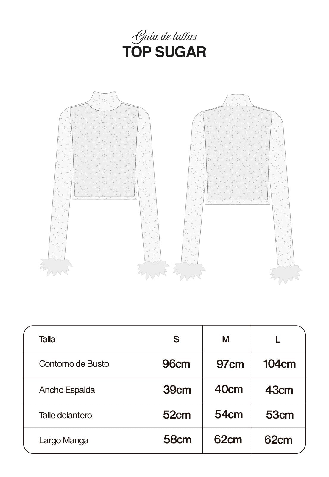 El Top Sugar, es una prenda manga larga con plumas en los puños y forro, hecha en una tela de tul delicado con lentejuelas.