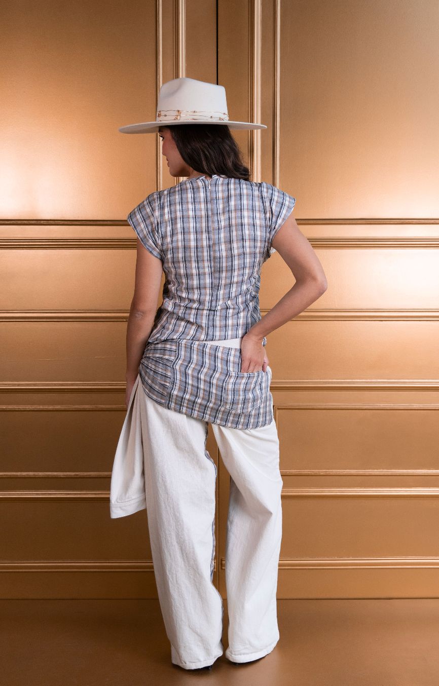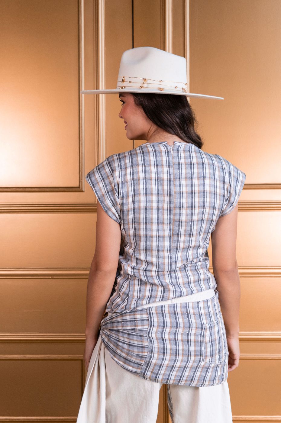 Top elaborado en tela de lentejuelas en el delantero y tela de cuadros en el posterior con detalles en hilo lurex, tiene hombreras para darle estructura