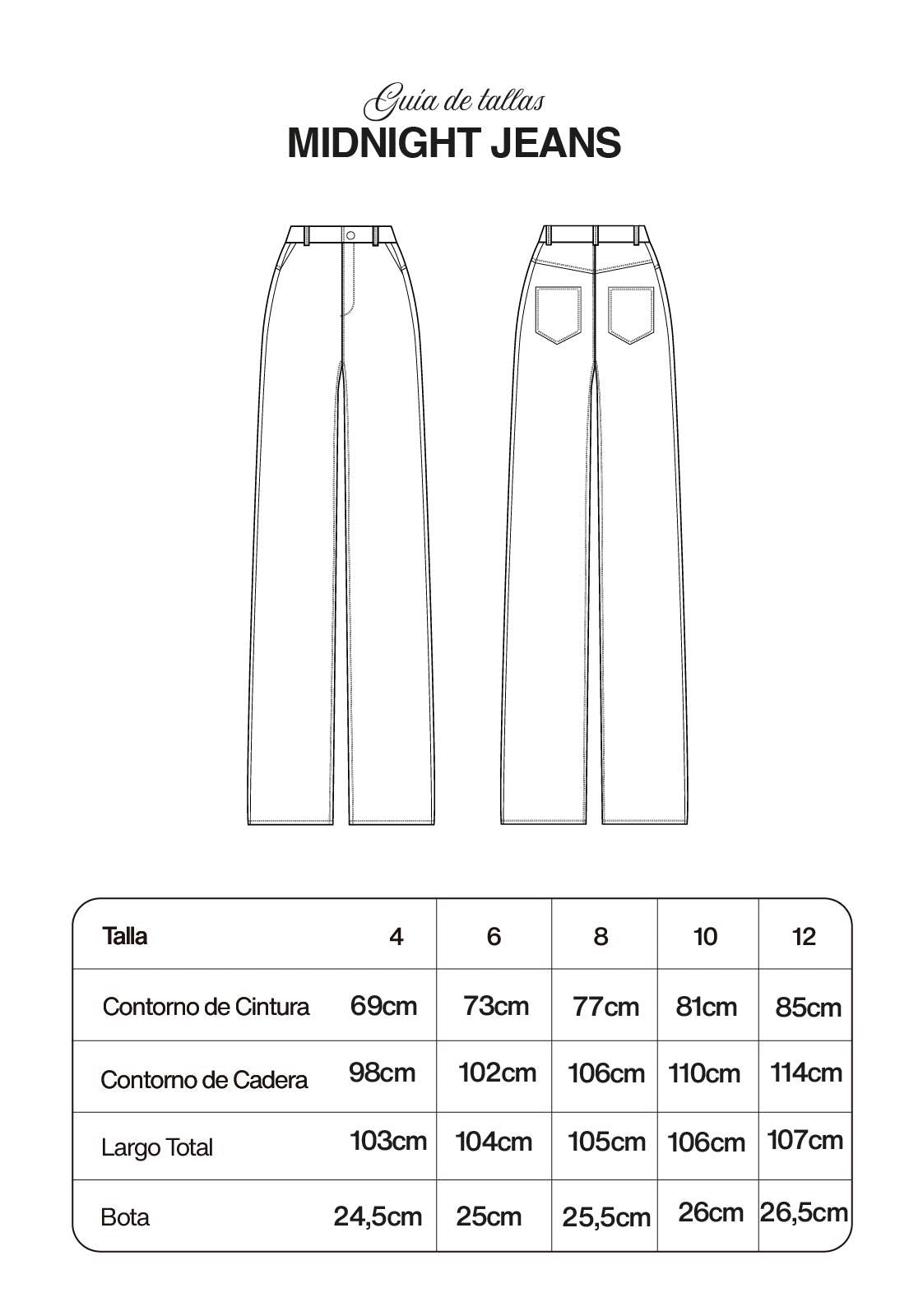 El Jean Midnight es un jean talle alto, bota recta con solapas de diseño en los costados, está hecho denim con acabado en Glitter dorado. Hecho en 100% algodón.