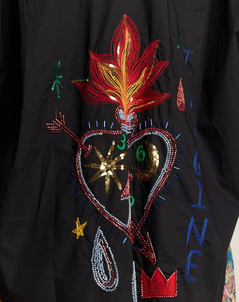 Camisa de cuello abotonada con mangas largas y puños. La camisa tiene un dobladillo redondeado. La camisa es negra y está bordada con gráficos.